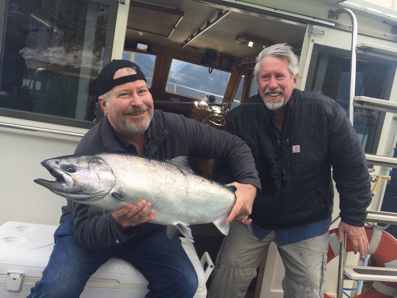 Captain Ken Gross and a happy guest with a beautiful bright Skagway King Salmon. September 2018.
